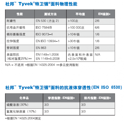与杜邦防化服面料机械性能相关的数据。若适用,选定服装的物理性能将根据测试方法和相关欧洲标准列出。抗磨损、抗挠裂、抗拉伸和抗穿刺等物理性能有助于进行防护性能评估。